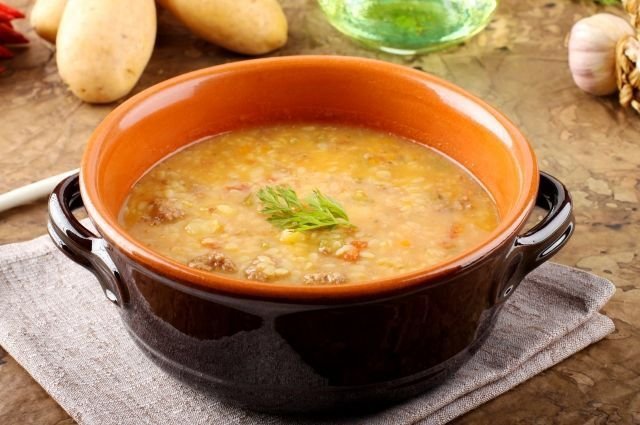 Суп на основе мясного бульона, с квашеной капустой и перловкой.