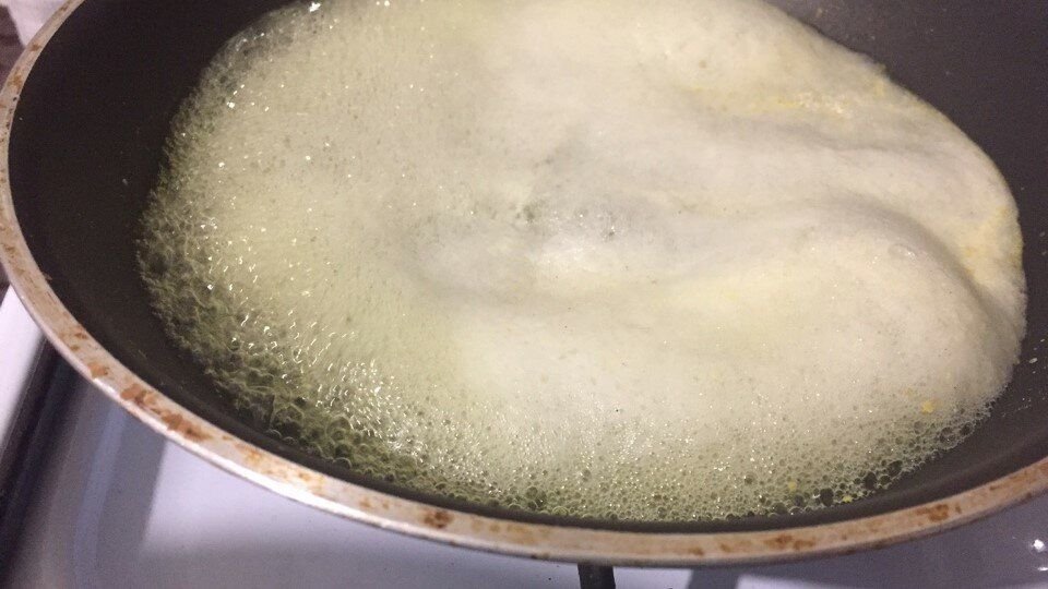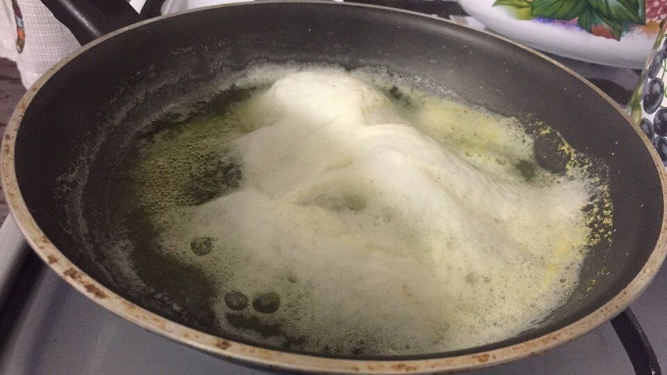 - Поставить сковороду на средний огонь и накрыть крышкой, всегда поглядывая, чтобы образовавшаяся пена не сильно поднялась (иначе она выбежит на газовую плиту).