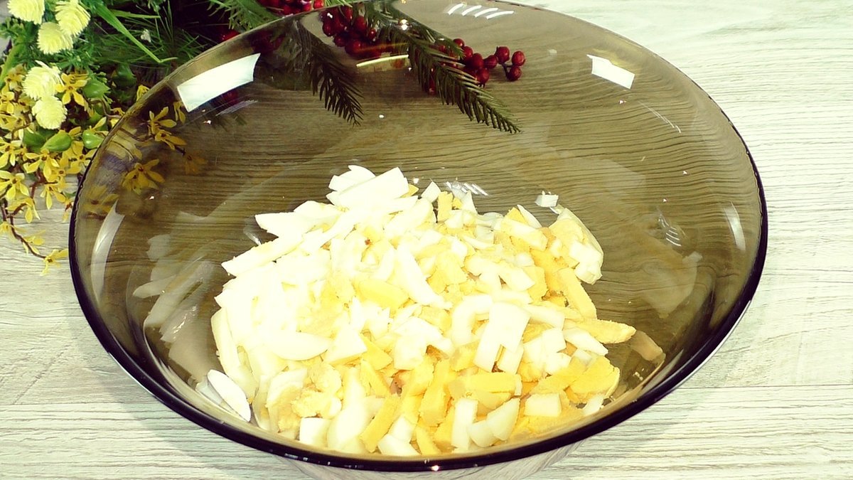 Салат готовится очень быстро, главное заранее отварить яйца. Отварные яйца измельчить и отправить в миску.