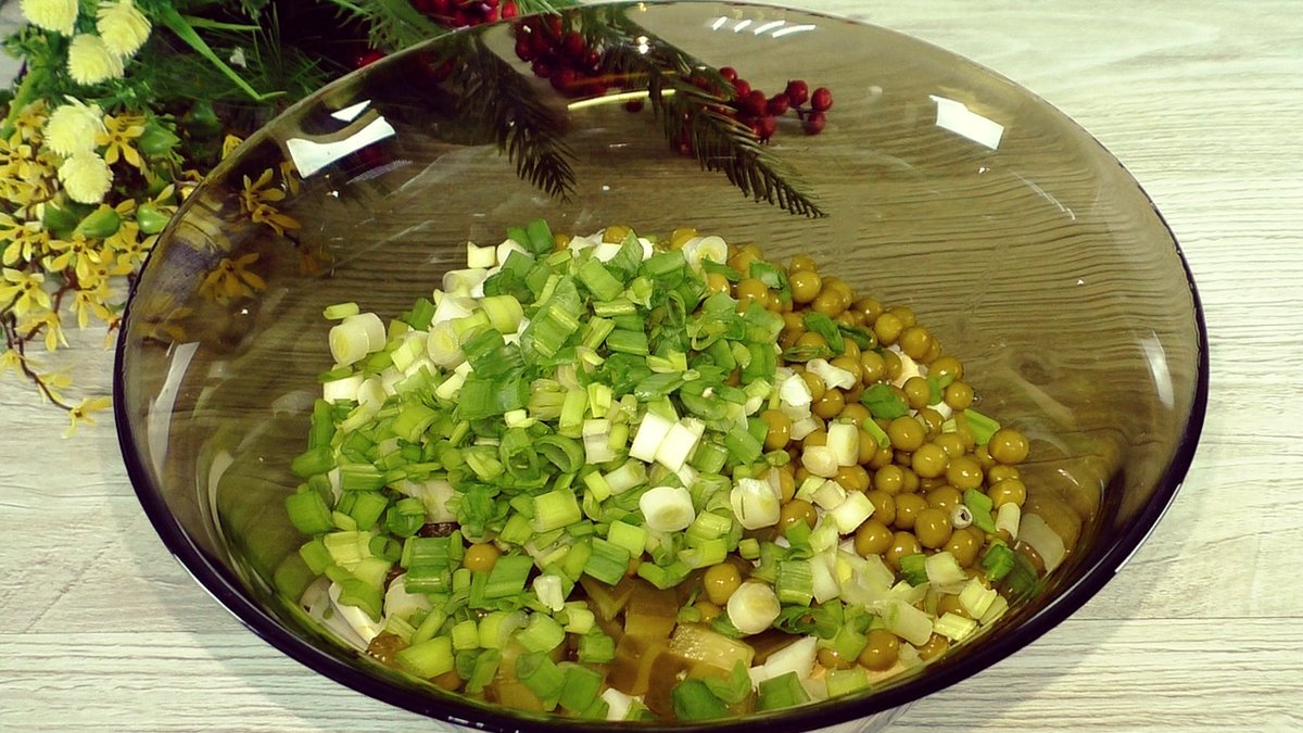 С консервированного горошка сливаю жидкость и добавляю в салат. Горошка можно добавить маленькую баночку, можно большую, ориентируйтесь по своему вкусу.
