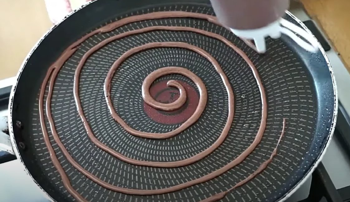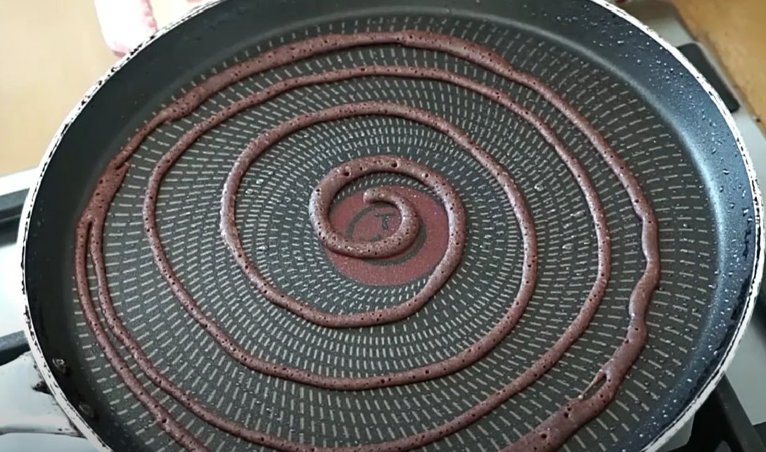 ШАГ 6: Темное тесто помещаем в кондитерский мешок или баночку, наподобие как от горчицы. Выдавливаем тесто в виде узора на смазанную сковороду.