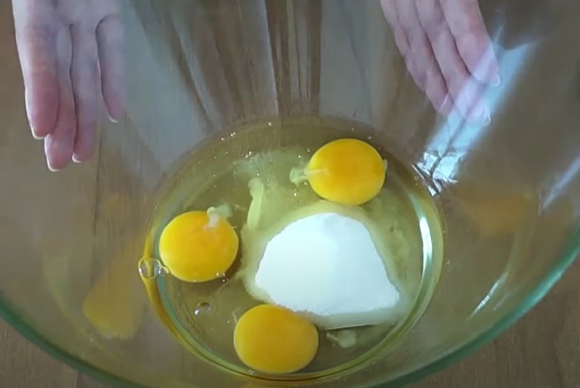 ШАГ 1: Яйца соединяем с сахаром и солью и хорошо взбиваем до образования пенки.
