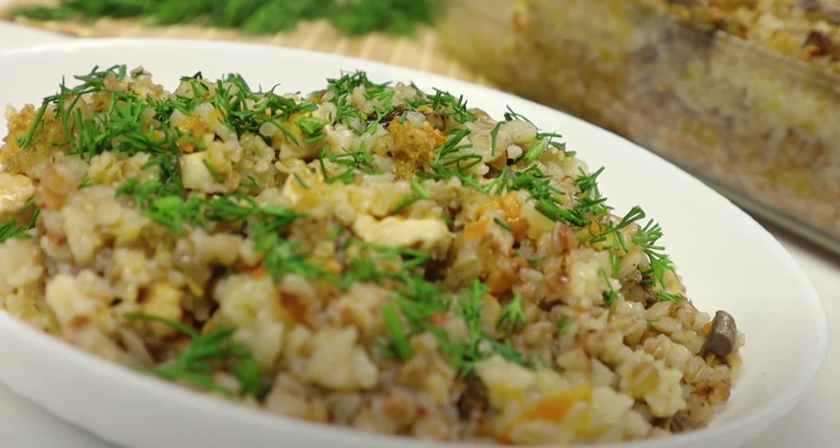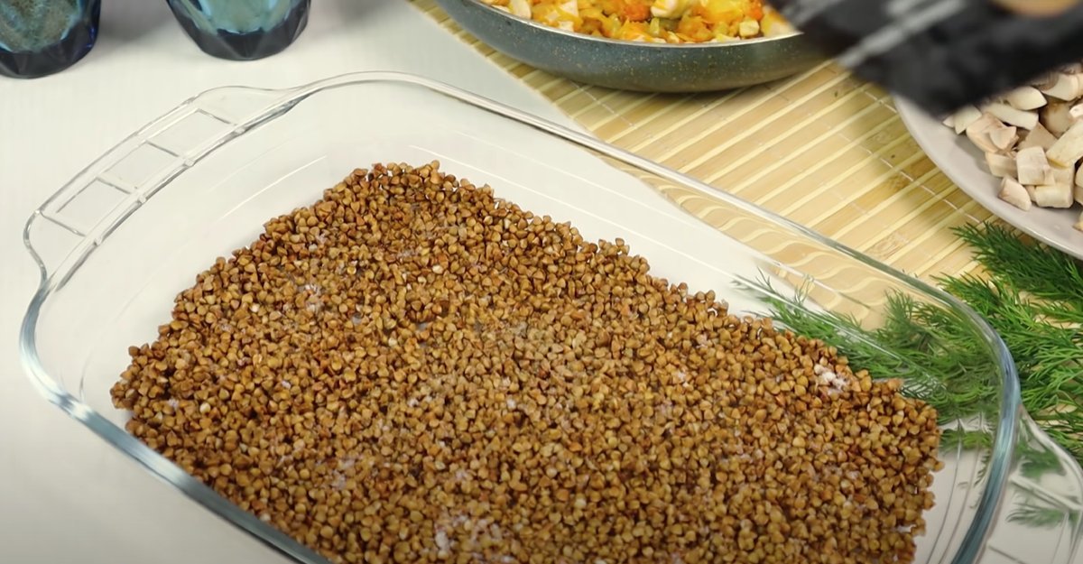 ШАГ 4: Крупу предварительно промываем. На дно формы выкладываем гречку.