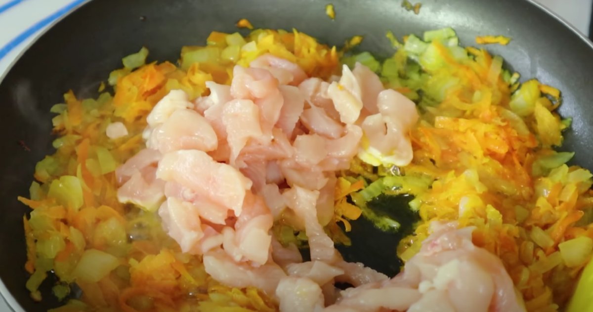 ШАГ 2: Добавляем порезанное филе курицы и обжариваем еще несколько минут, пока мясо не побелеет.