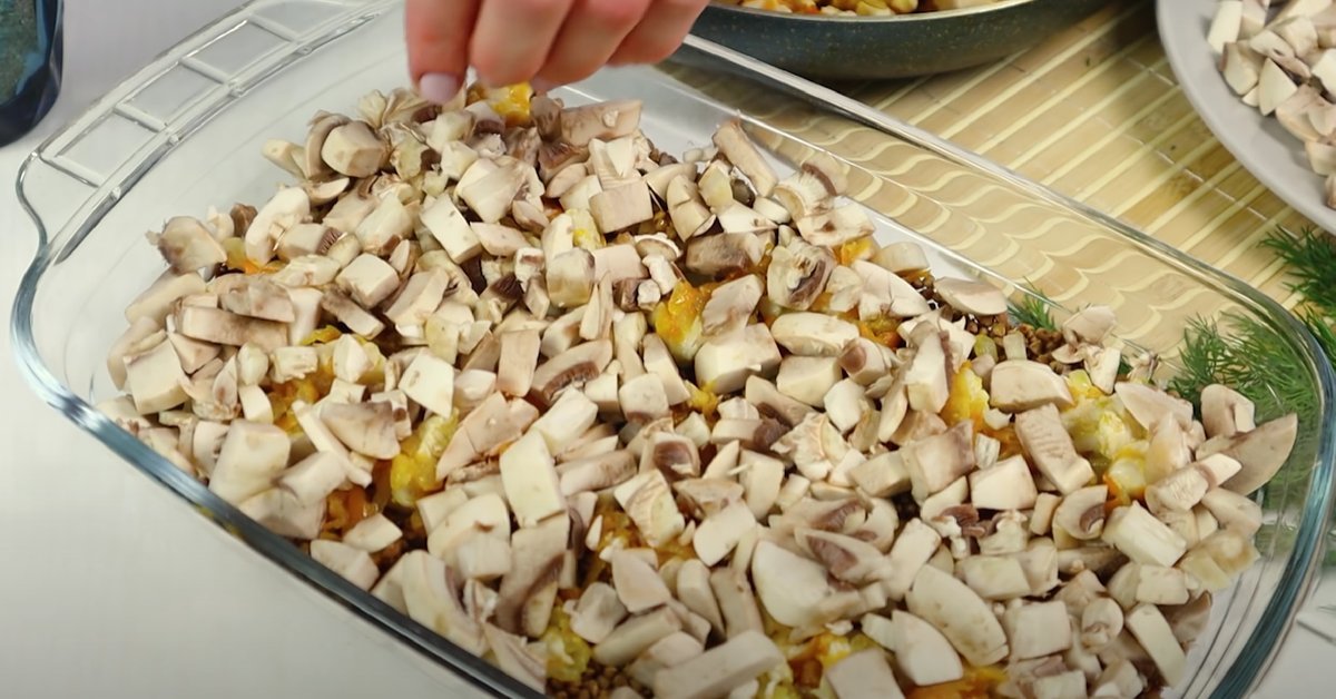 ШАГ 5: Выкладываем половину курицы с овощами и грибы.