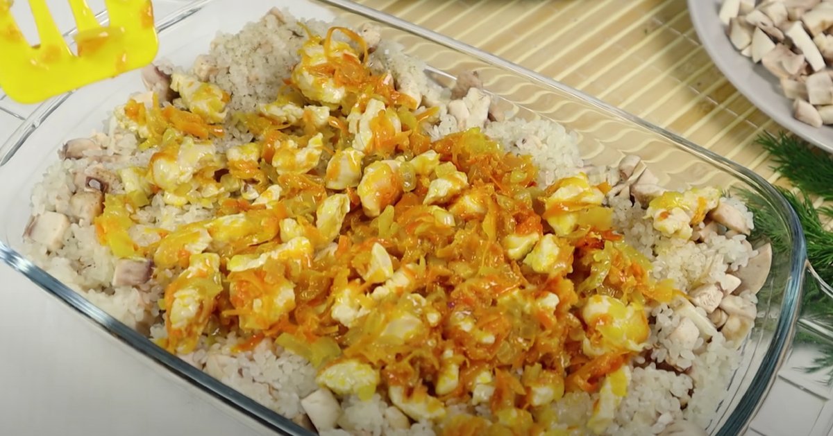 ШАГ 6: Далее выкладываем рис и оставшуюся часть курицы, овощей и грибов.