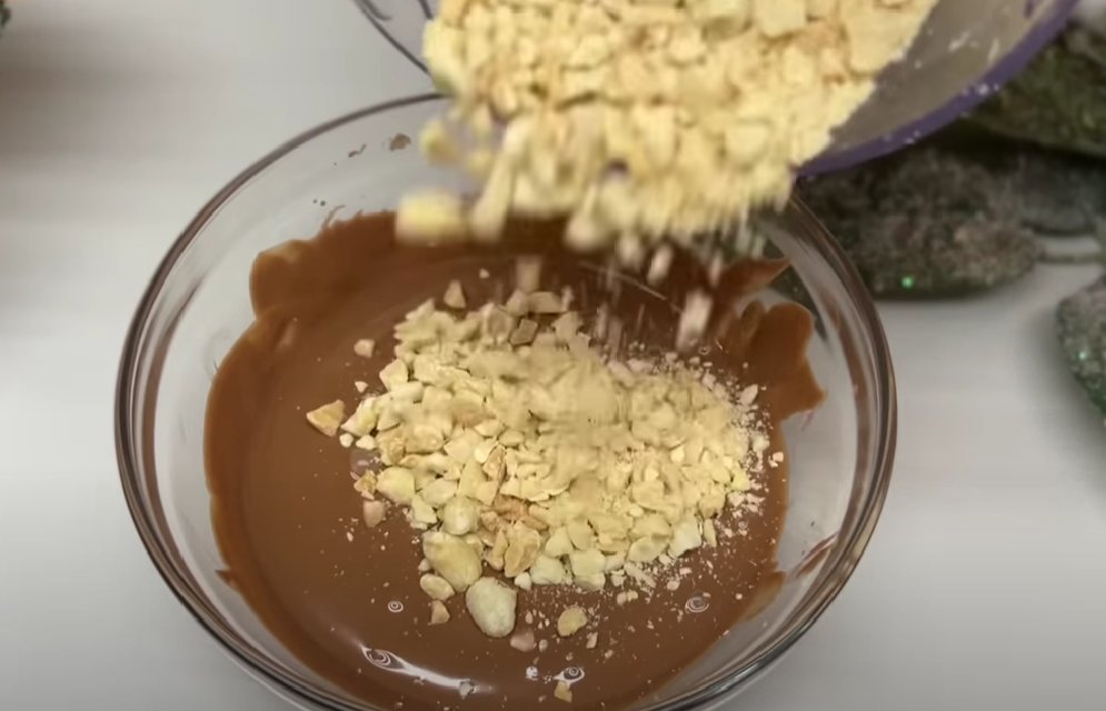 ШАГ 6: Для глазури растопим 2 небольшие плитки шоколада, добавим арахис (слегка порубленный) и немного растительного масла.