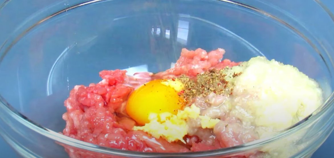 ШАГ 1: Приготовим фарш (или возьмем готовый). Мясо и лук прокрутим через мясорубку, добавим яйцо, чеснок, перец, соль. Хорошо перемешаем, отобьём и оставим настояться на 30 минут.