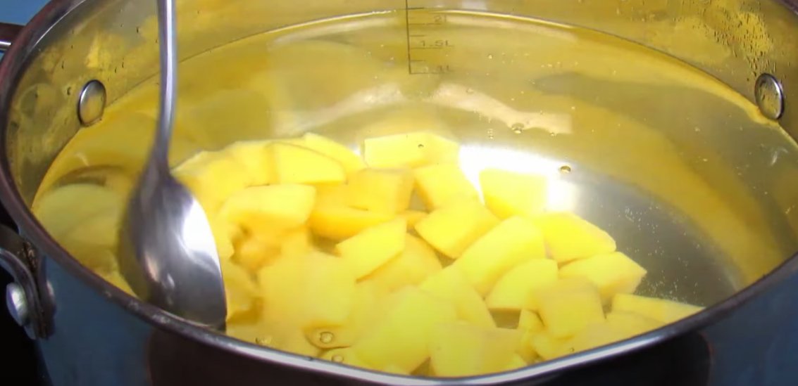 ШАГ 2: Картофель нарежем средним кубиком. Зальём холодной водой и поставим на огонь.
