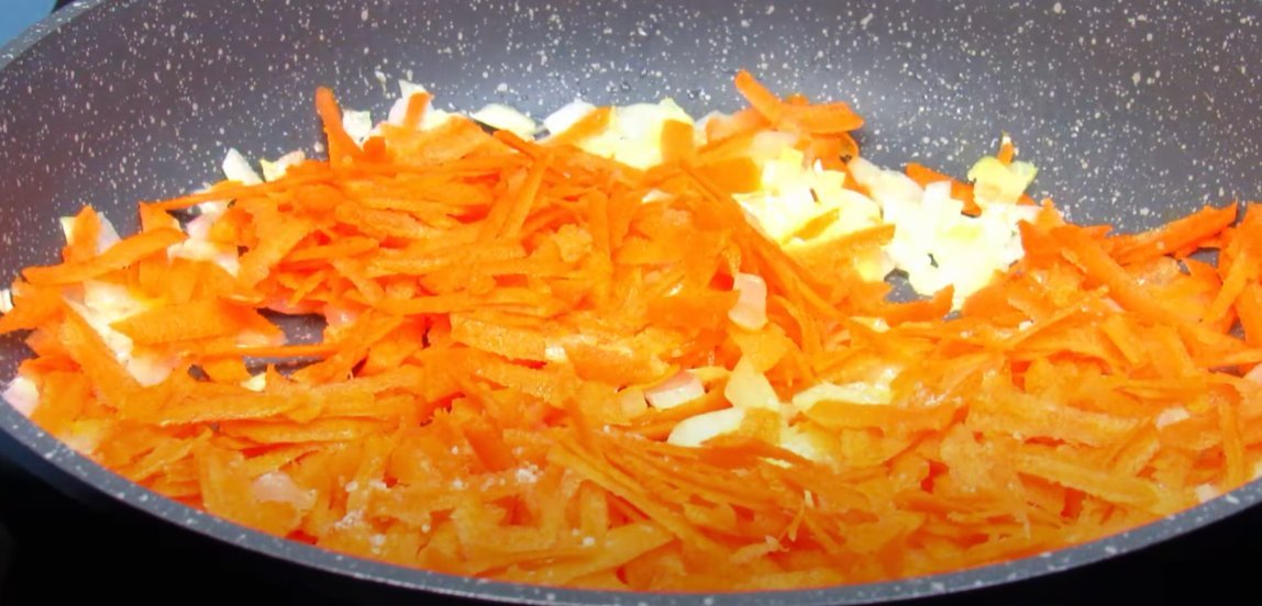 ШАГ4: Приготовим зажарку из лука и моркови. Сперва обжарим лук, потом добавим морковь и доведем овощи до готовности.