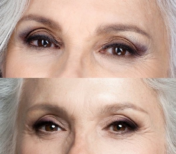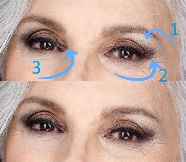 Без темных теней и карандаша получить явный лифтинг эффект глаз очень сложно, поэтому если вы пользуетесь темными тенями для вытягивания формы, корректировки нависания и прочего, то не выводите темный пигмент на места скопления морщин. Особенно аккуратно следует работать тенями фиолетовых, зеленых и синих цветов и их оттенков — они нередко не только подчеркивают морщины, круги под глазами, но и делают макияж грязным как раз из-за рельефа возрастной кожи. Тут дам совет — старайтесь темные тени наносить во внешние уголки глаз на подвижное веко, а уже выводить растушевку на подвижное веко тенями более приемлемых оттенков — тауп, беж, коричневый.