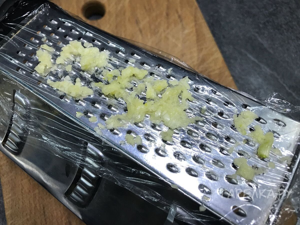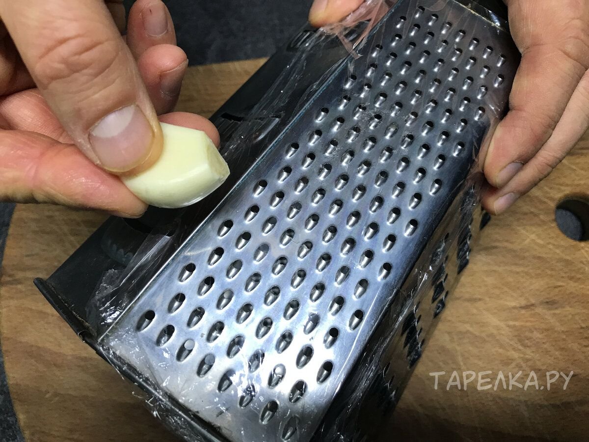 Поверхность со средним размером зубца, наверное, самая универсальная в терке. На ней можно измельчить некрупно любые продукты. Если обернуть терку пищевой пленкой, и воспользоваться ее поверхностью со средним размером зубца для измельчения чеснока, то он весь останется на пленке, что очень удобно.
