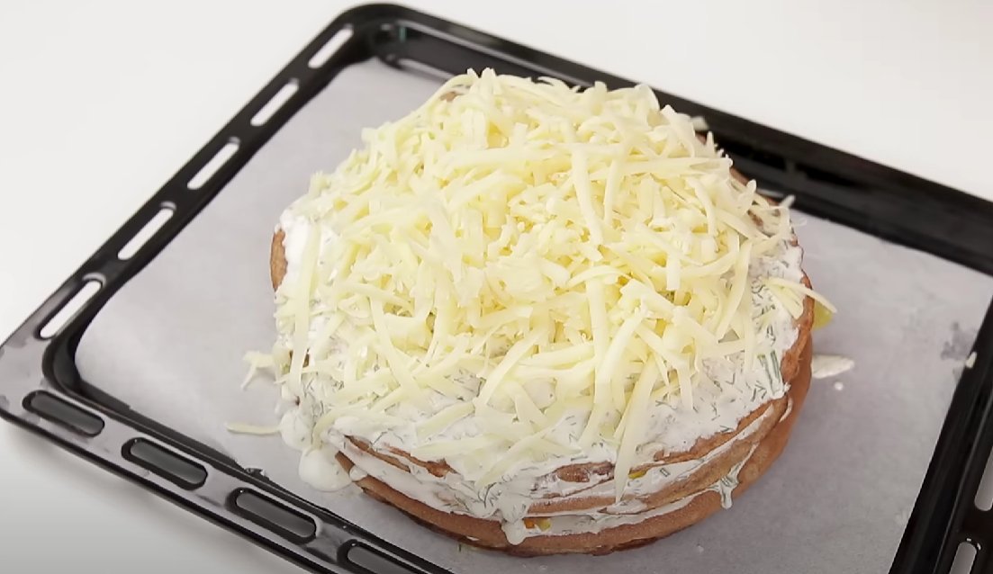 ШАГ 9: Сверху тортик присыпаем тертым сыром и отправляем в духовку на 10 минут при 200 гр.