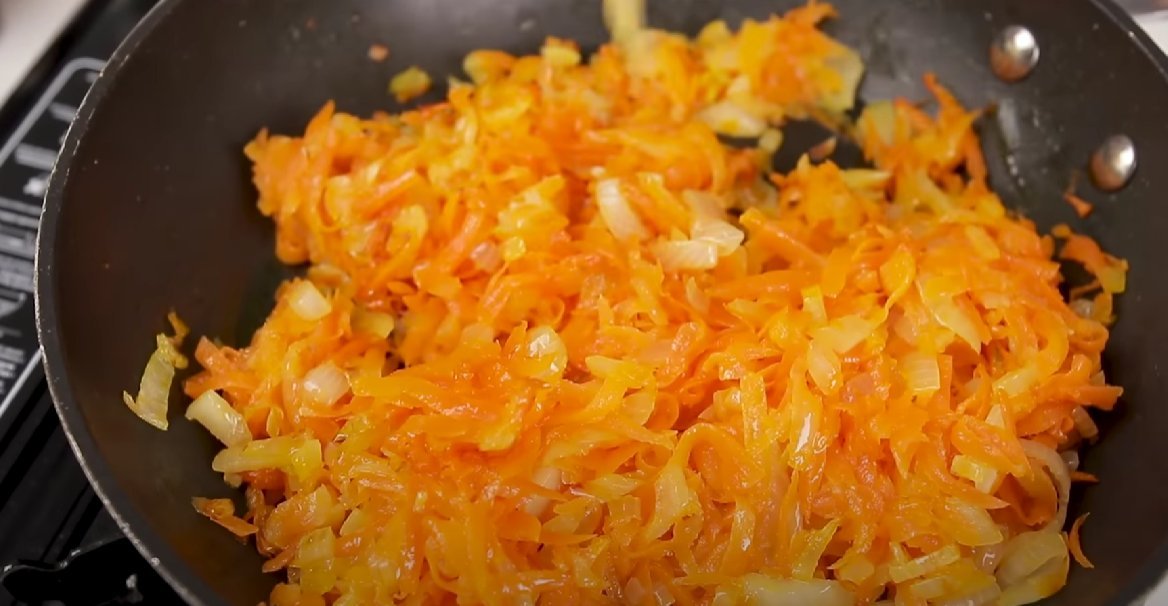 ШАГ 5: Отдельно обжариваем лук и морковь до мягкости, присаливаем.