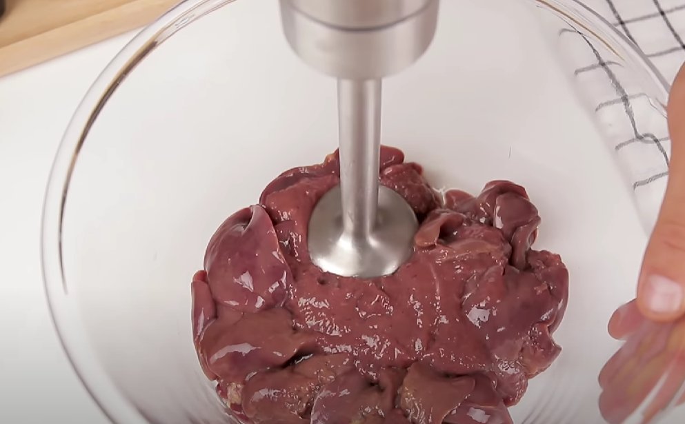 ШАГ 1: Куриную печенку взбиваем блендером до однородной массы,