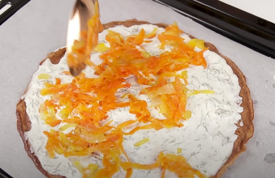 ШАГ 8: Блинчик промазываем соусом и добавляем немного овощей. Разравниваем и закрываем вторым блином. Так используем все продукты.