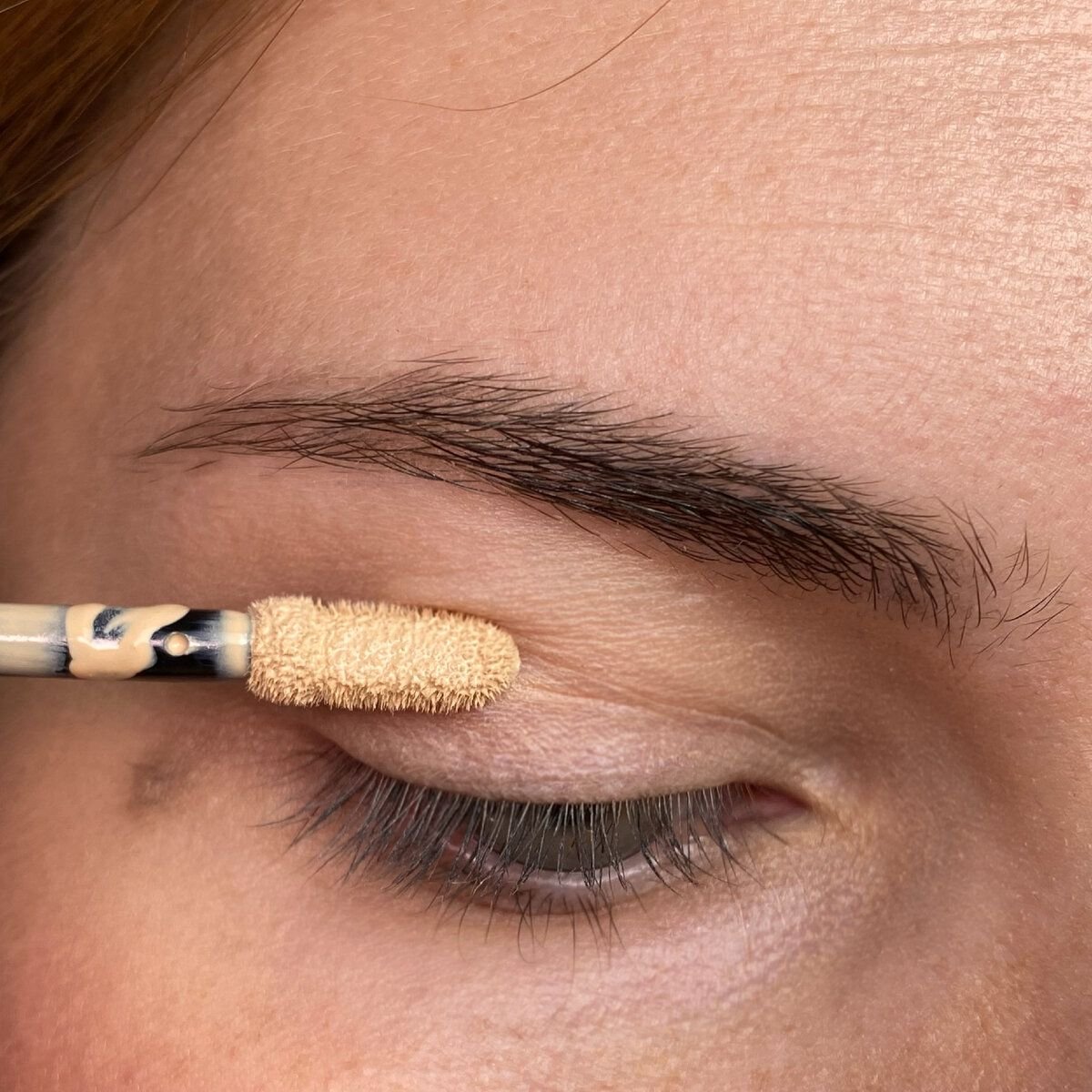 Подготавливаем веко консилером: просто наношу и распределяю притаптывающими движениями пальцем или кистью. В данном случае нам нужен консилер для теней, а не для самой стрелки.