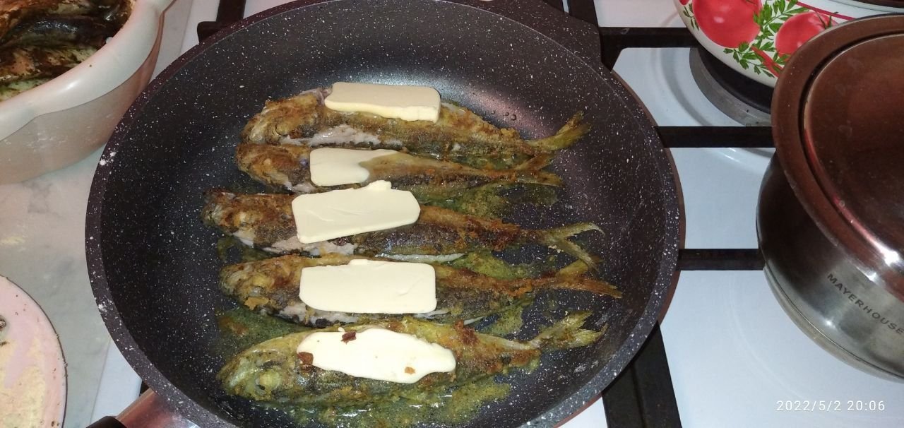 Классически обжариваем одну сторону до золотистой корочки, перевернули рыбу, и вот здесь начинается магия. На каждую рыбью тушку выкладываем кусками сливочное масло. Именно сливочное масло в панировке с кукурузной мукой и даёт этот вкусовой эффект.