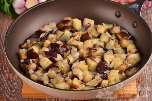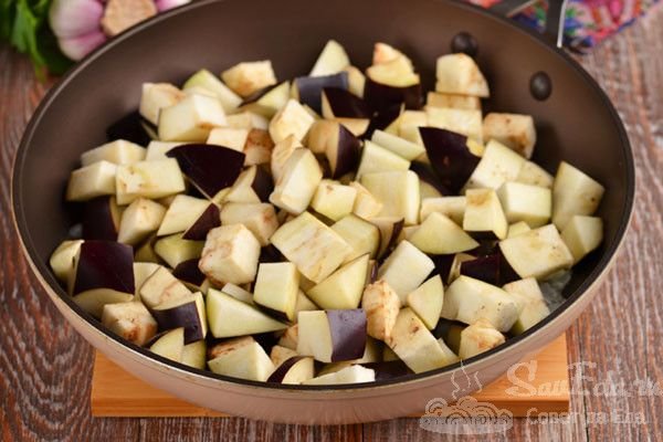 2. Баклажаны нарезаем на кубики среднего размера и отправляем в лук. Перемешиваем, накрываем крышкой и готовим 10 минут. Периодически помешиваем.