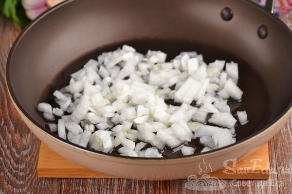 1. Лук нарезаем и выкладываем масло. Готовим на выше средней температуре, помешивая, несколько минут. Он должен стать немного мягким.