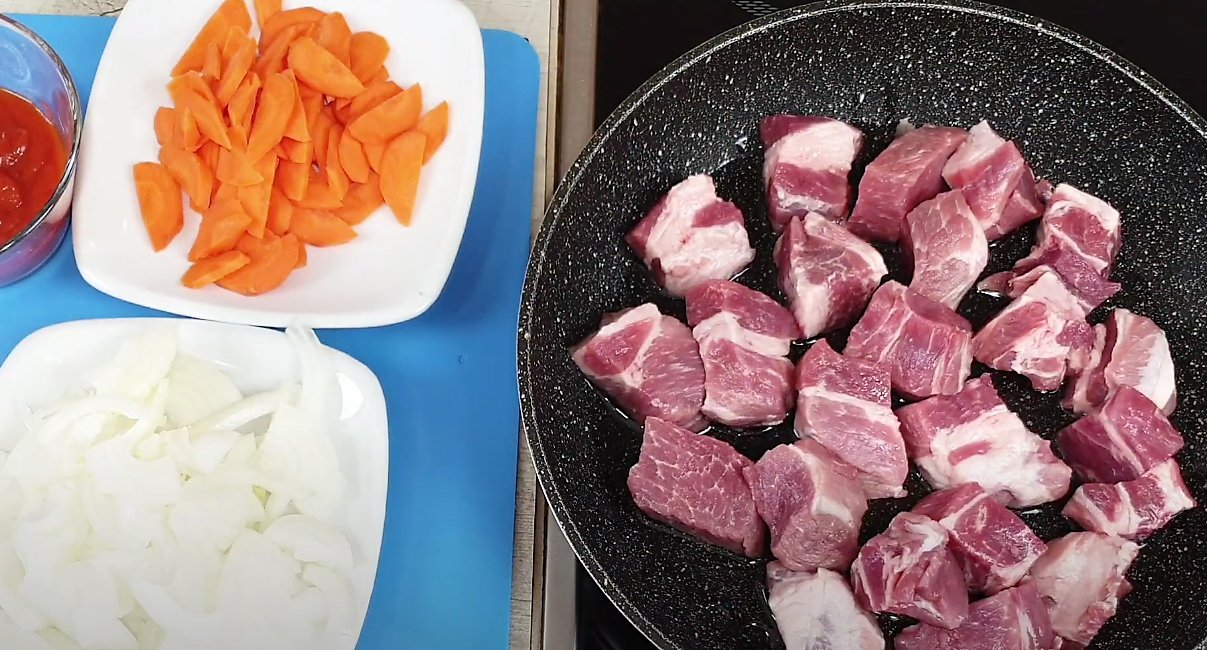 Лук нарезаем полукольцами, морковку — слайсами. Мясо, порезанное на средние кусочки обжариваем на растительном масле.