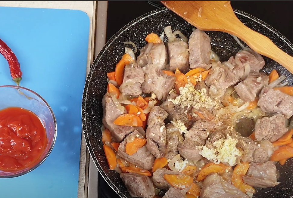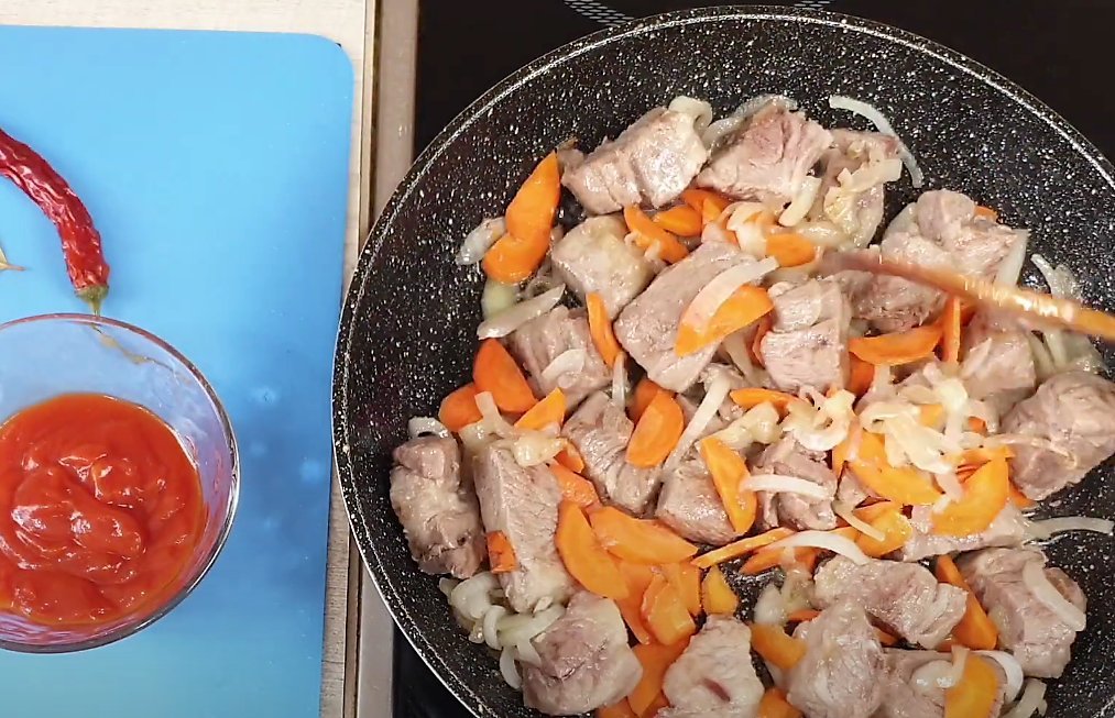 Когда мясо достаточно запечатается, добавляем лук с морковкой и продолжаем обжарку.