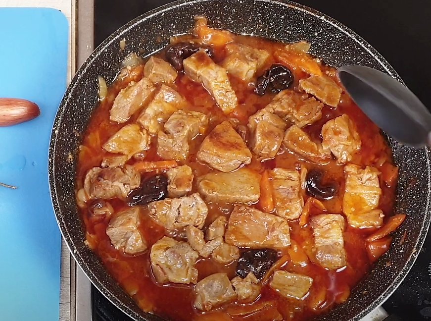 Доливаем стакан бульона, либо воды и закладываем сухофрукты — изюм и чернослив. Закрываем крышкой и тушим на маленьком огне 1 час (если мясо — говядина,то 1,5 часа)