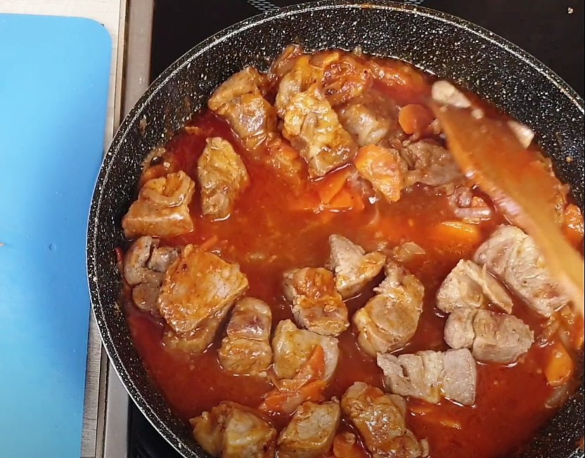 Следующим этапом идет добавление томатного соуса. Не пасты, а именно соуса. Хорошо перемешиваем блюдо.