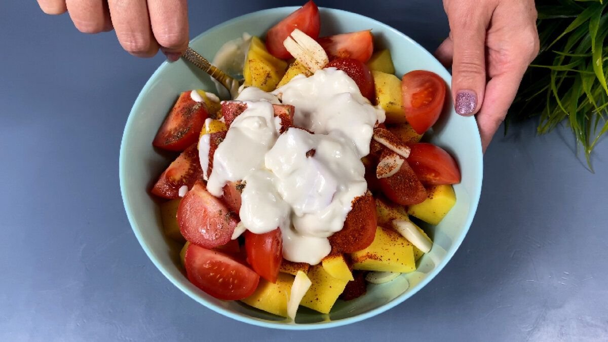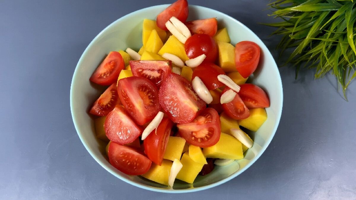2. Добавляем мелко нарезанный репчатый лук, крупно нарезанный картофель, помидоры нарезанные крупными дольками и чеснок нарезанный пластинами.