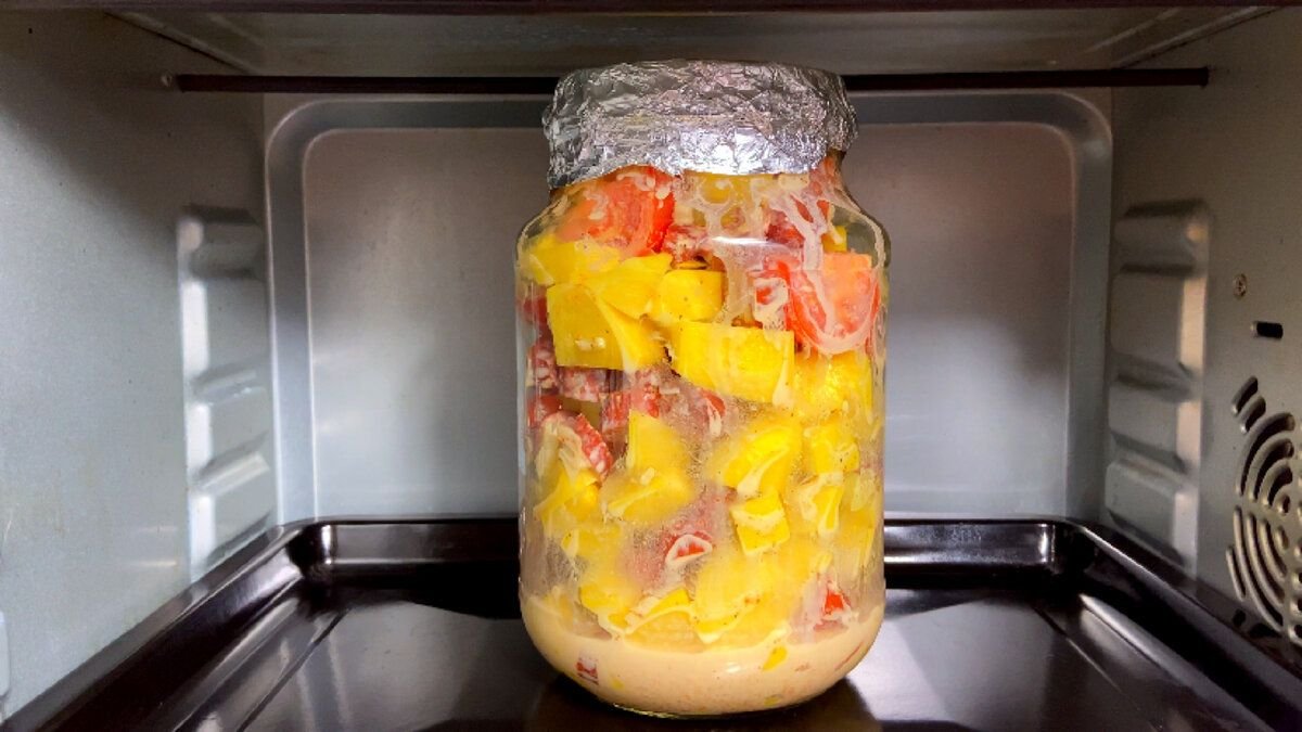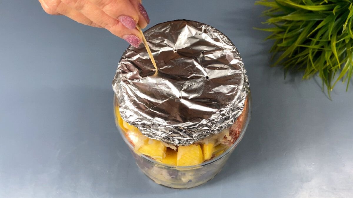 4. Закрываем банку фольгой для запекания, делаем в фольге отверстия зубочисткой, отправляем банку в холодную духовку и только потом ее включаем на 190 градусов на 80 минут, чтобы банка не лопнула.