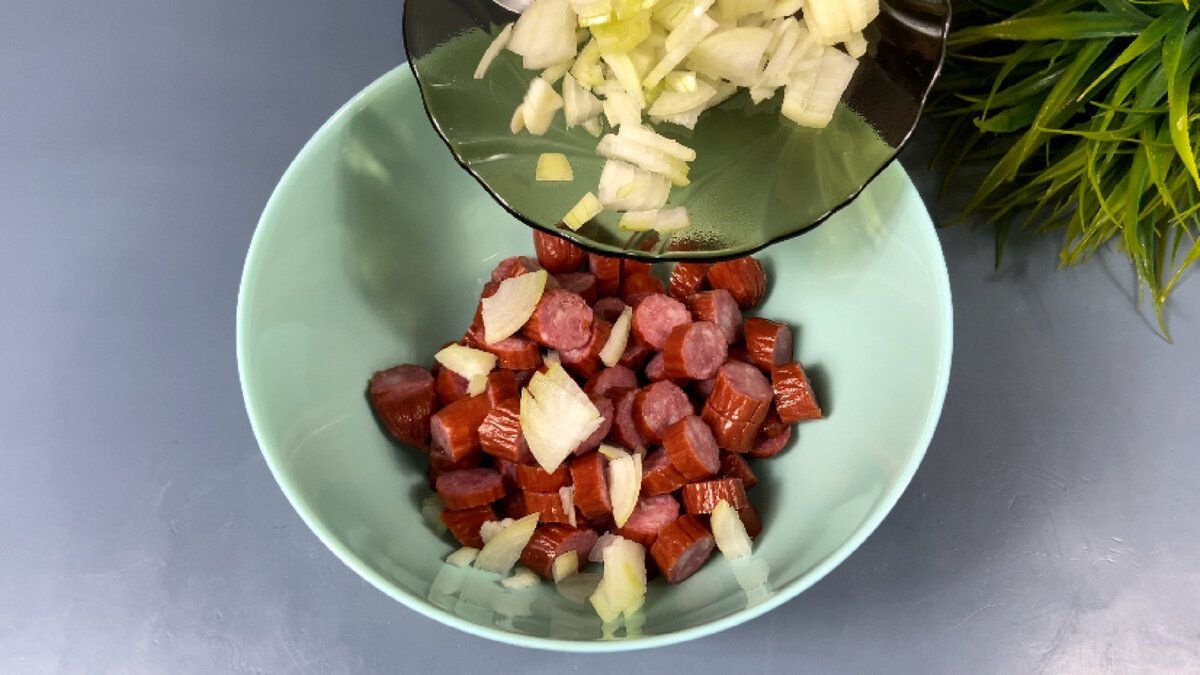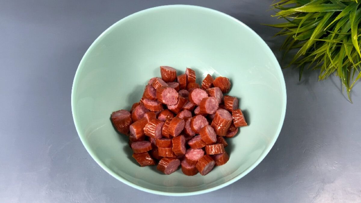 1. Охотничьи колбаски нарезаем толстыми колечками и отправляем в глубокую миску.