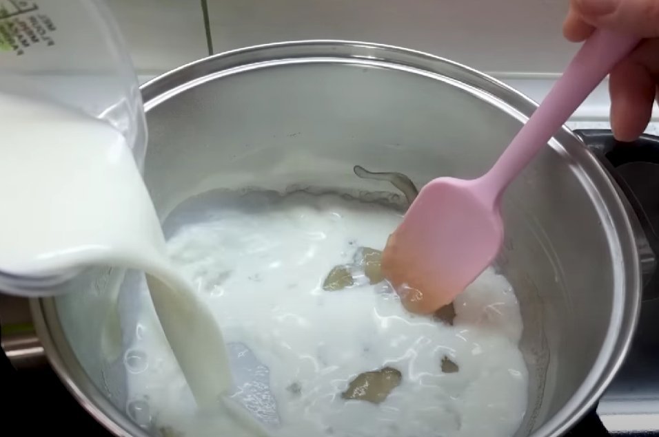 ШАГ 2: Агар-агар (иле желатин) соединяем с водой и слегка нагреваем, помешивая. Вливаем молоко, продолжаем мешать.