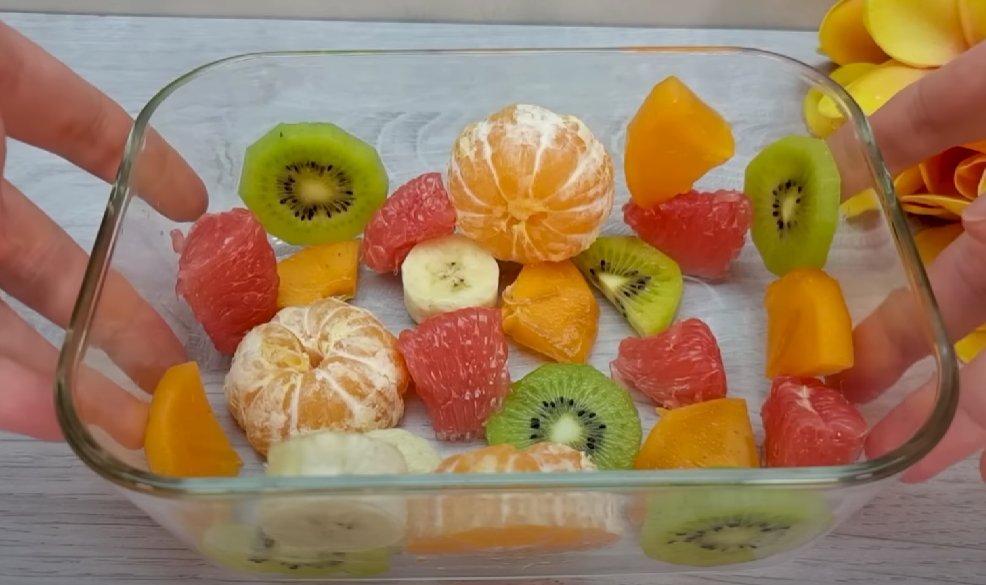 ШАГ 1: Берем любые фрукты. Большую часть нарезаем небольшим кубиком, а часть выкладываем в форму, как на фото.