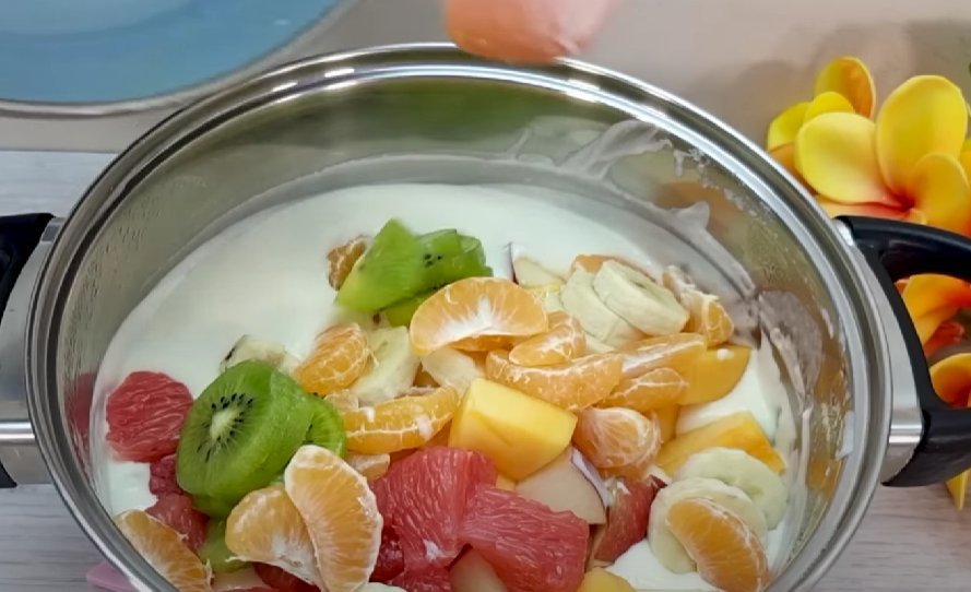 ШАГ 5: Добавляем нарезанные фрукты, перемешиваем.