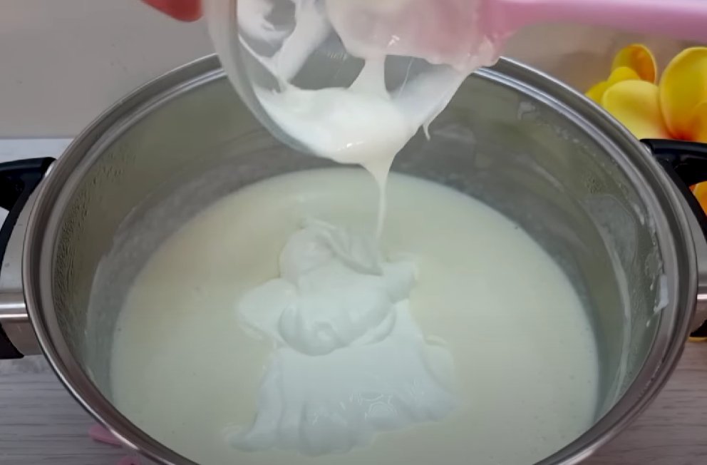 ШАГ 4: Вводим сметану, перемешиваем. Убираем с огня. Масса должно быть немного густоватой, как кефир.