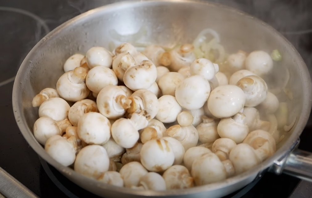 ШАГ 2: Как только лук станет мягким, добавляем грибы (заранее промытые и обсушенные). В данном случае грибы мелкие, а если у вас они крупнее, то разрежьте на 2-4 части. Обжариваем грибы с луком пару минут.