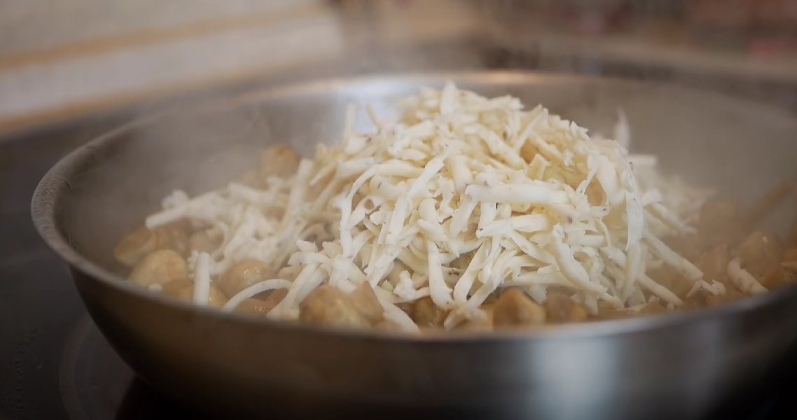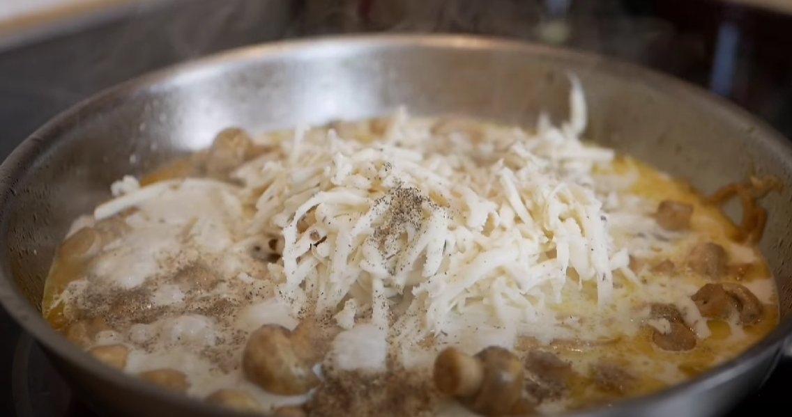 ШАГ 4: Вливаем молоко. Добавляем соль и перец по вкусу. Как только сыр расплавится — отправляем в сковороду печень (промытую и нарезаную на небольшие кусочки).