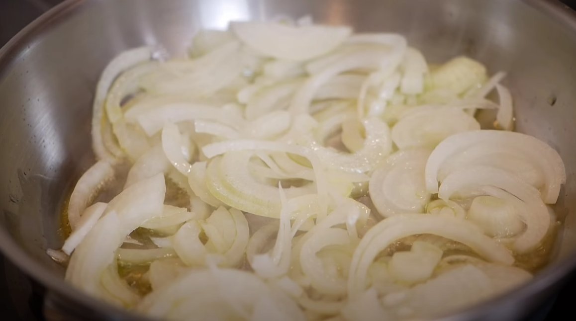 ШАГ 1: Луковицу нарезаем полукольцами и обжариваем на сковороде с добавлением растительного масла,