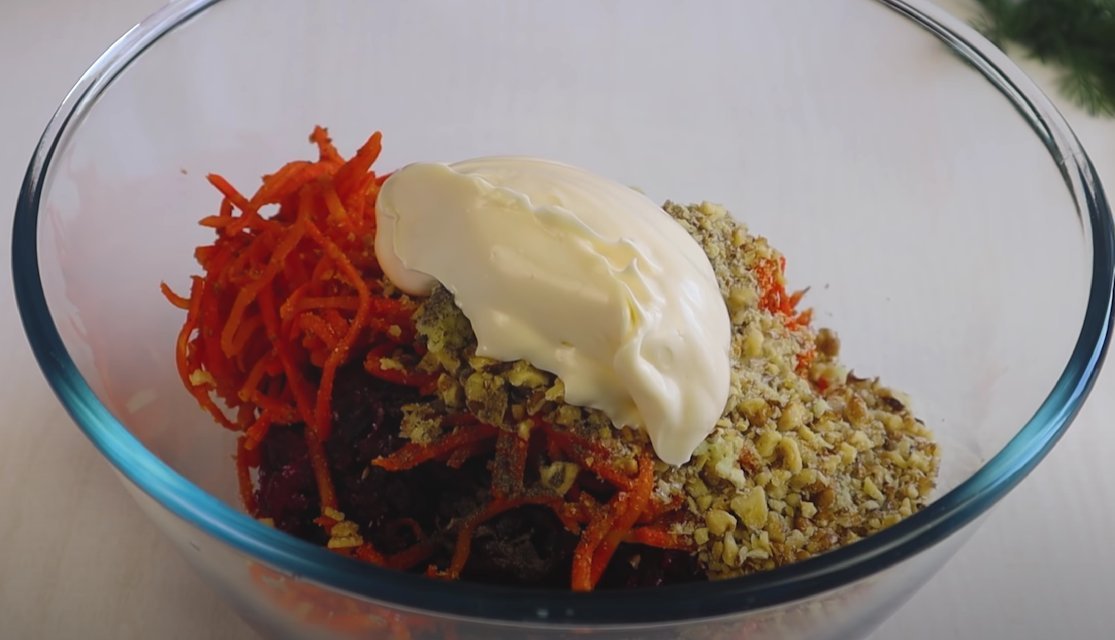 ШАГ 2: Орехи измельчим и добавим в салат. Чеснок выдавим через пресс. Соль и перец — по вкусу. Заправка из майонеза. Перемешаем. Салат готов!