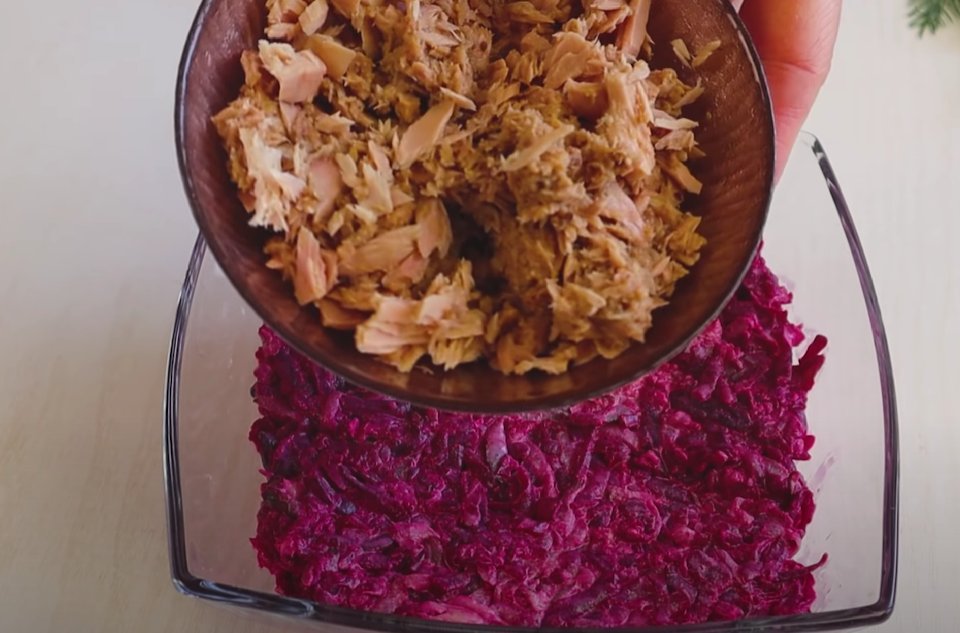 ШАГ 3: Выкладываем свекольную часть первым слоем. А вторым — рыбные консервы. Сеточка из майонеза.