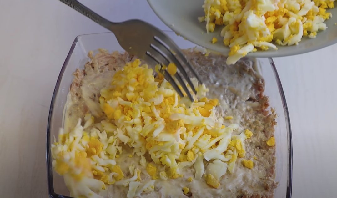 ШАГ 4: Отварные яйца натрем на крупной терке и выложим поверх рыбы. Легкая майонезная сетка и украшение из зелени укропа.