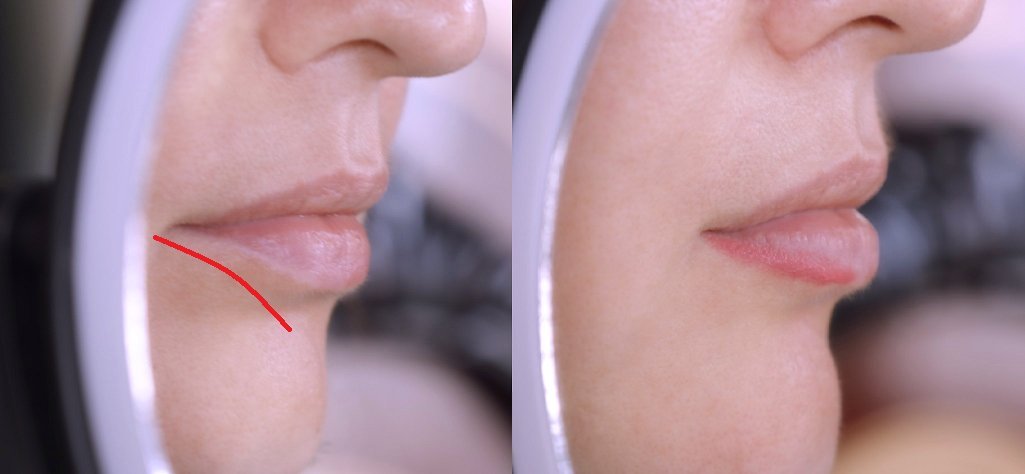 Просто попробуйте посмотреть на себя сбоку. Есть трельяж? Отлично. Вот глядя в него можно отлично это увидеть. Нет подобного предмета интерьера? Просто поднесите зеркало к лицу сбоку, при этом смотрите на себя в другое зеркало. Очень часто с возрастом нижняя губа изгибается так, как я показала на фото ниже красной линией. И для того, чтобы визуально улучшить ее вид, достаточно чуточку закруглить губы в этих областях (провела линию карандашом по контуру как нужно).