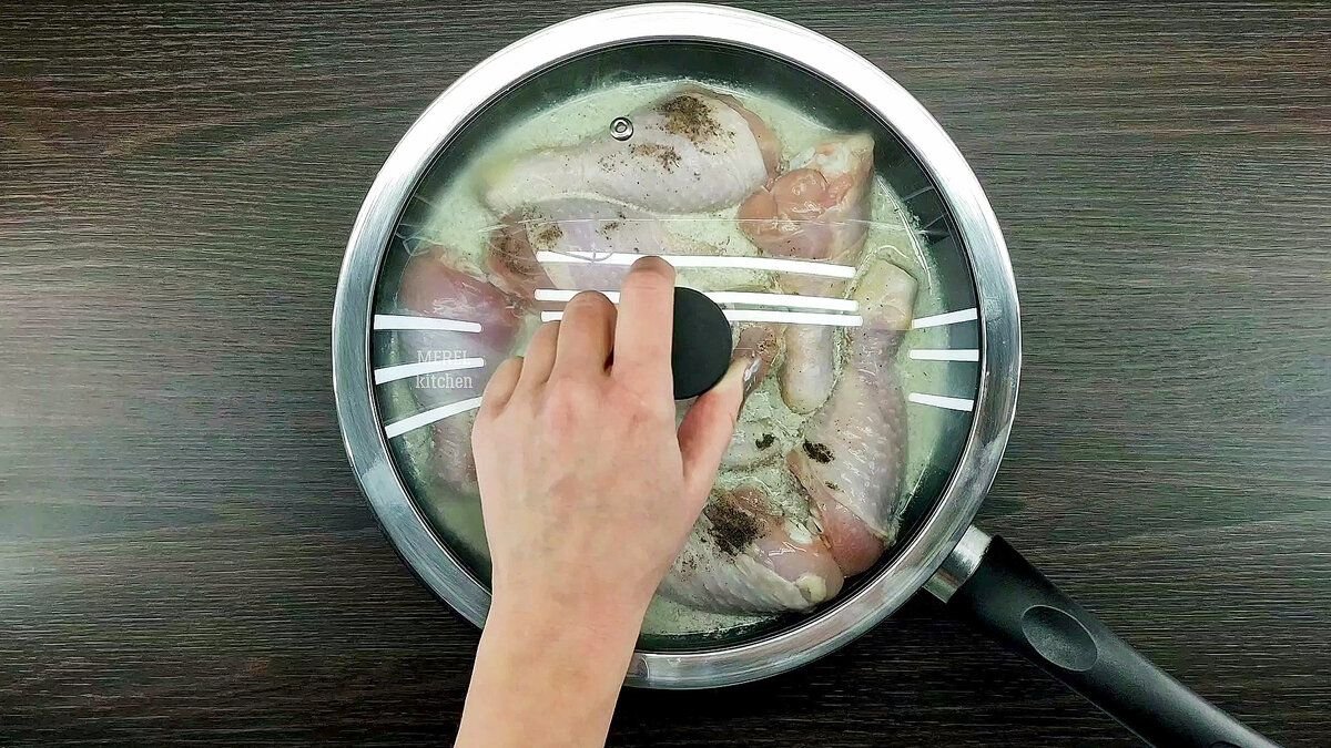 Накрыть крышкой и тушить на медленном огне примерно 15 минут. Затем куриные голени перевернуть и томить еще под крышкой 15 минут. Снимаем курицу с огня.