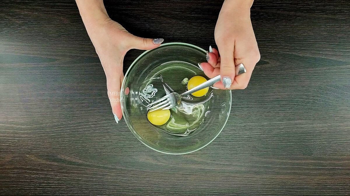 Затем берем небольшую тарелку или миску, разбиваем в нее два яйца и взбиваем.
