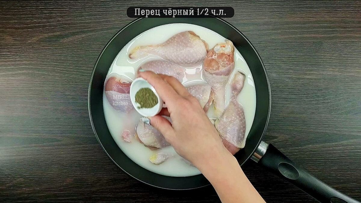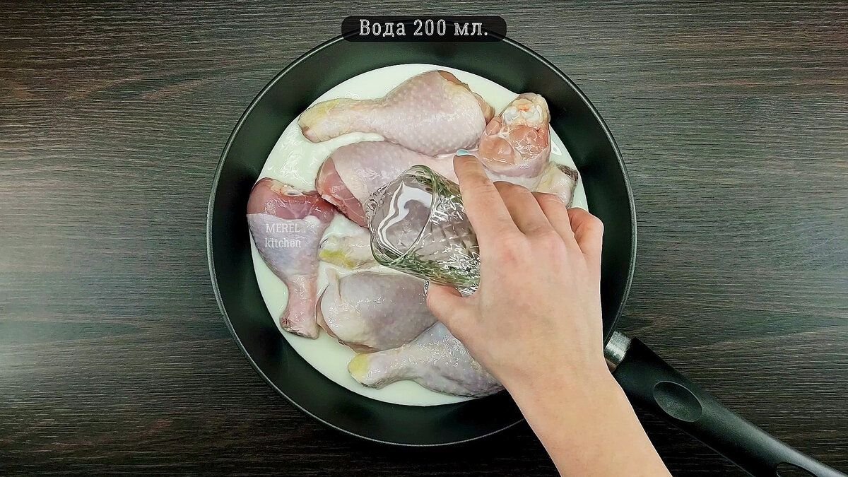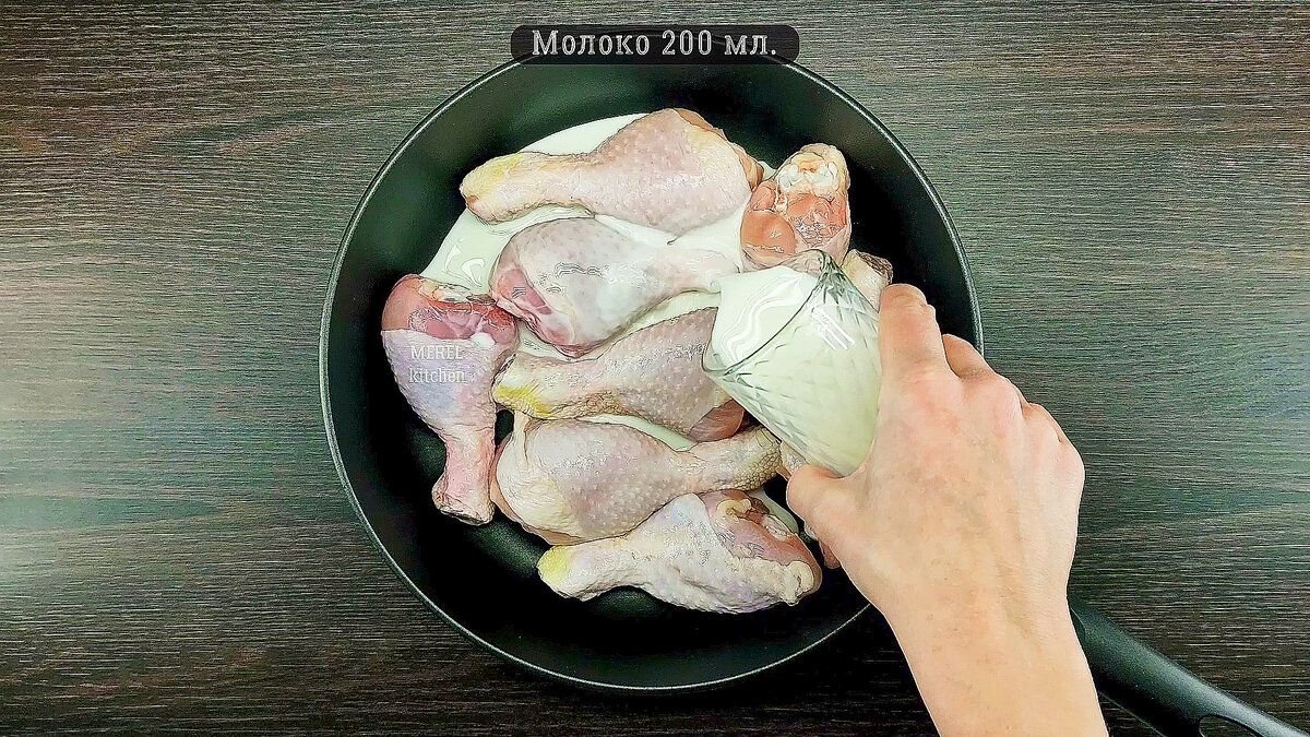 Для приготовления понадобятся куриные голени восемь штук. Голени нужно переложить в сковородку и залить молоком 200 миллилитров и добавить столько же воды.