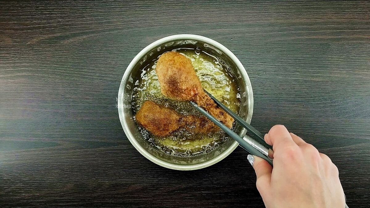 Опускаем куриные голени в раскалённое масла и обжариваем их во фритюре до золотистого цвета. В процессе жарки нужно переворачивать голени, чтобы они были обжарены со всех сторон, ну будьте осторожны с маслом и следите, чтобы щипцы или вилка, которой будете переворачивать была полностью сухая.