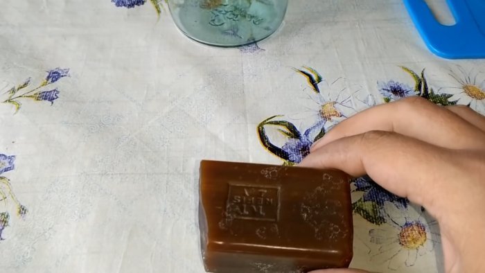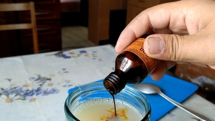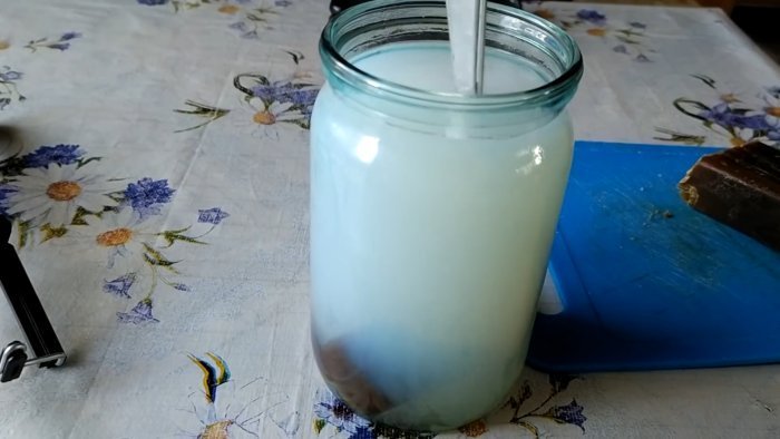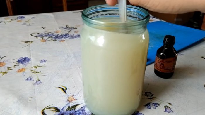 Нам понадобится вода, дегтярное мыло и флакончик настойки йода. Отделяем от целого куска дегтярного мыла 1/4 часть и помещаем ее в литровую банку. Наливаем в емкость с дегтярным мылом крутой кипяток, а чтобы мыло быстрее и полностью растворилось, интенсивно размешиваем содержимое банки столовой ложкой.