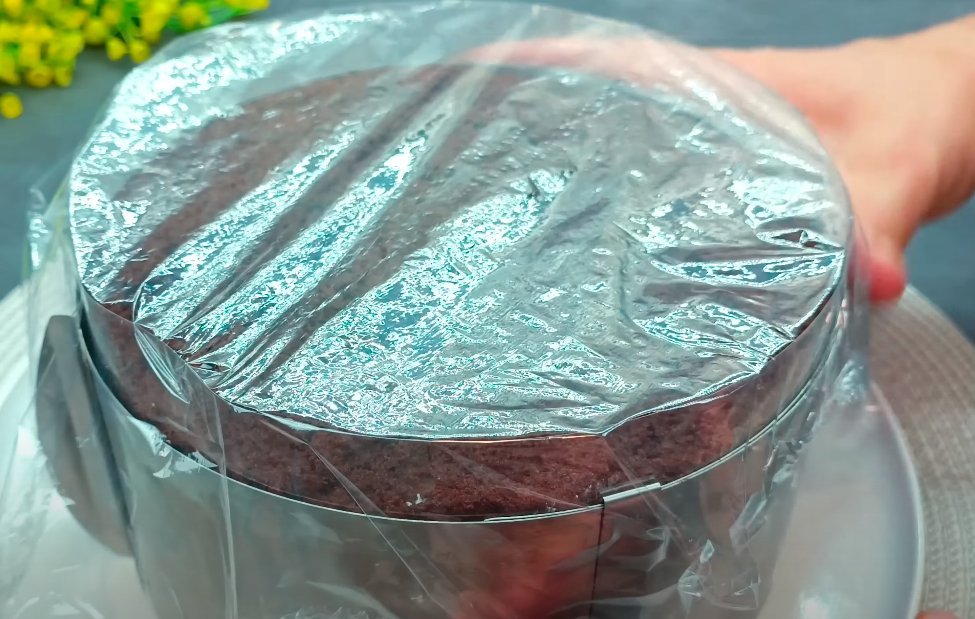 ШАГ 10: Накрываем собранный торт пленкой и ставим пропитываться на 4 часа в холодное место.