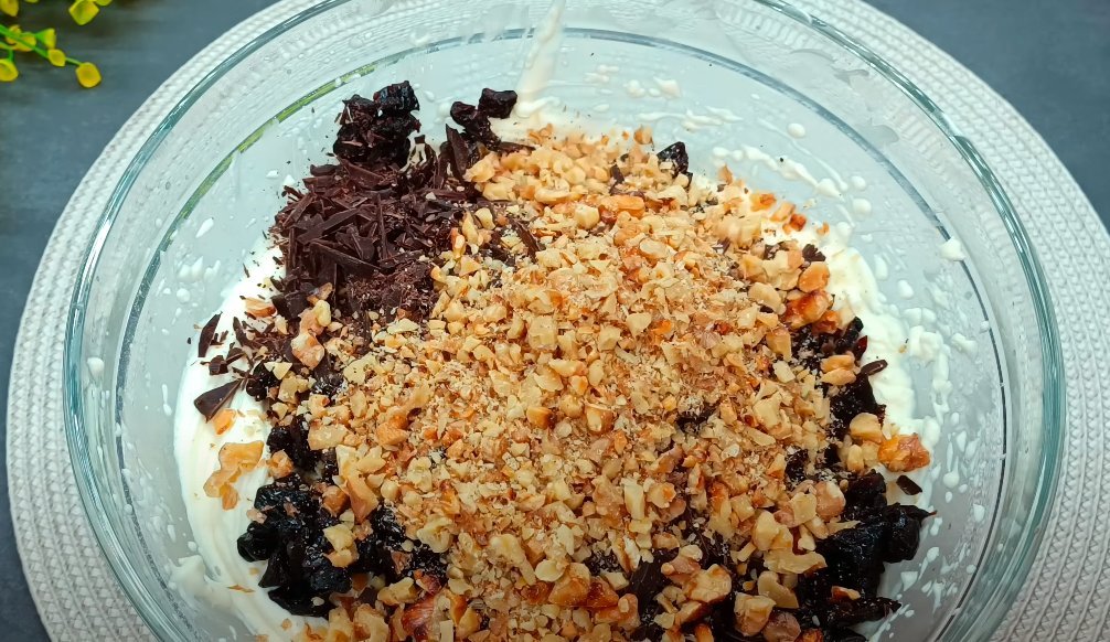 ШАГ 7: Орехи мелко рубим, чернослив нарезаем на небольшие кусочки, шоколад режем ножом. Соединяем продукты с кремом и хорошо перемешиваем.