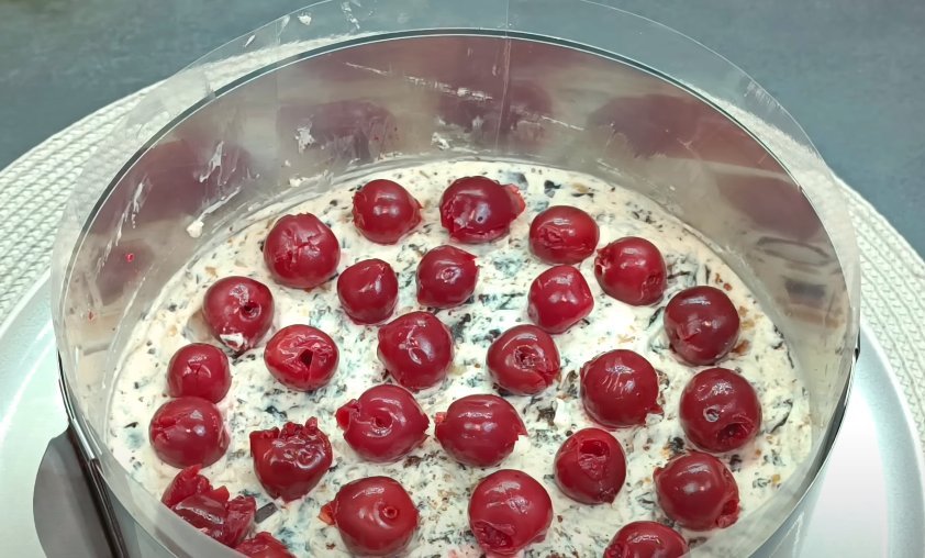 ШАГ 9: Промазываем коржи кремом и выкладываем вишню (свежая или из компота)